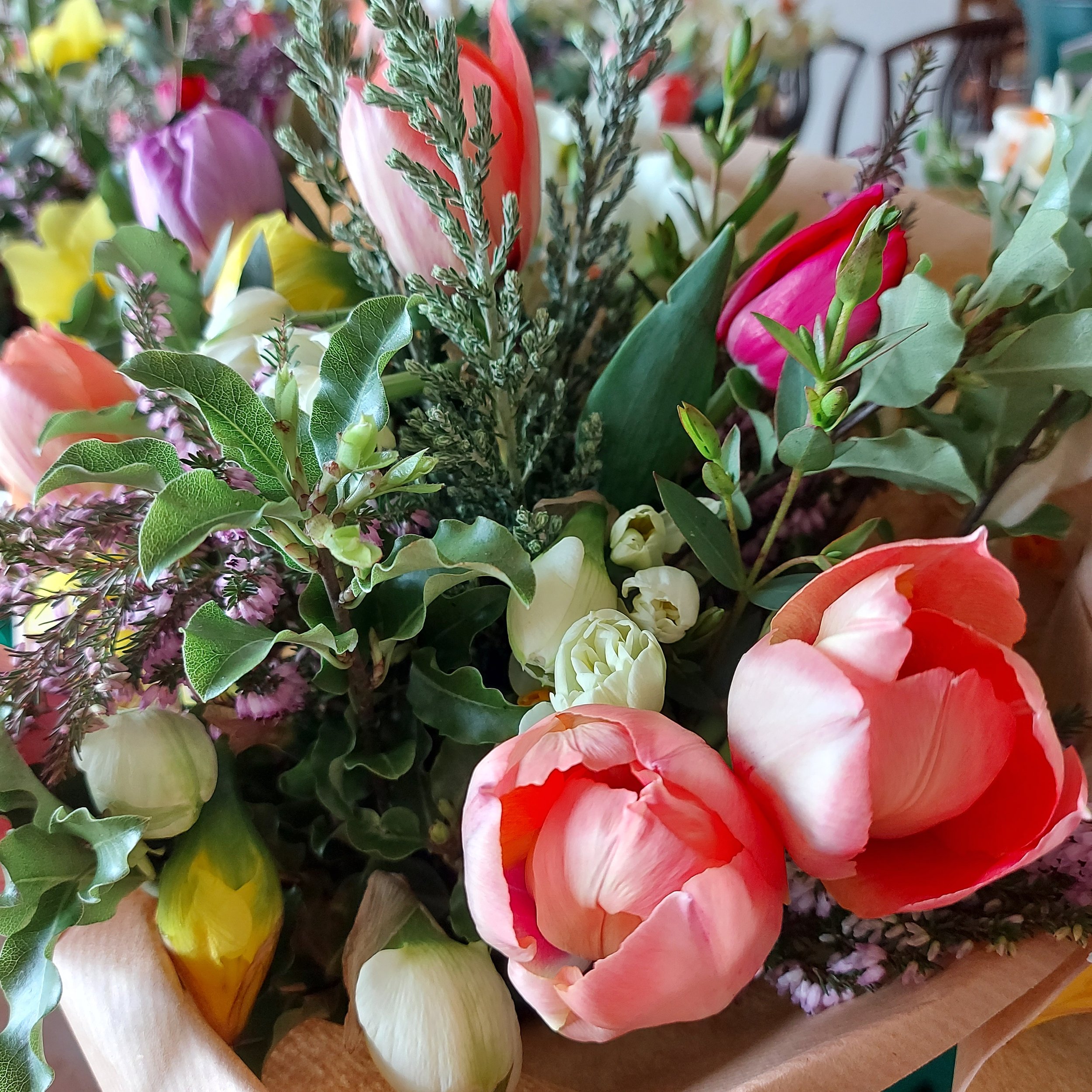 A generous and beautiful bouquet wrapped in kraft paper. It will contain Narcissus, tulips, butterfly ranunculus and hellebores and foliage. All grown here.